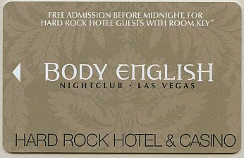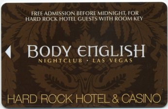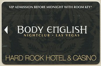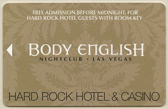 Hard Rock Hotel & Casino NV, Las Vegas Body English / olive key / "Free Admission Before..." at top No Manufacturer Mark Horizontal / Wide / RKG #00477 |