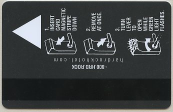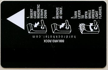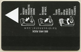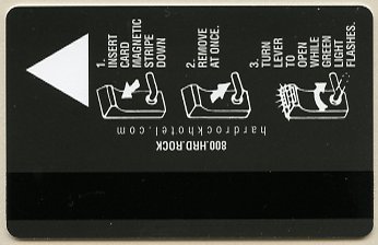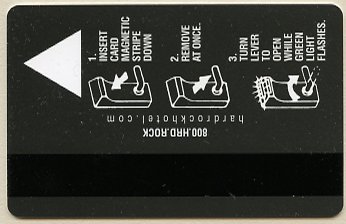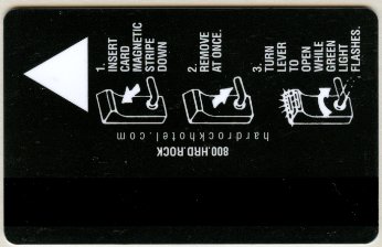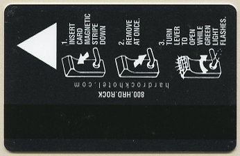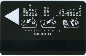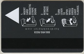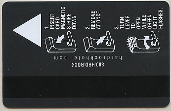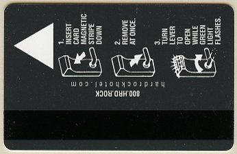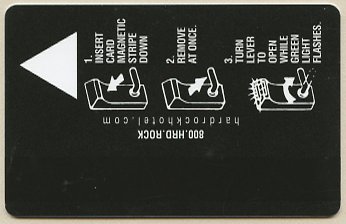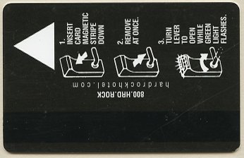 Hard Rock Hotel & Casino NV, Las Vegas Lightning bolt / black key, red stripe / white "Hotel" No Manufacturer Mark Vertical / Wide / RKG #00490 Narrow lettering on back of key, typestyle difference clearly visible on "G" & "R", "slot" line present where key is to be inserted |